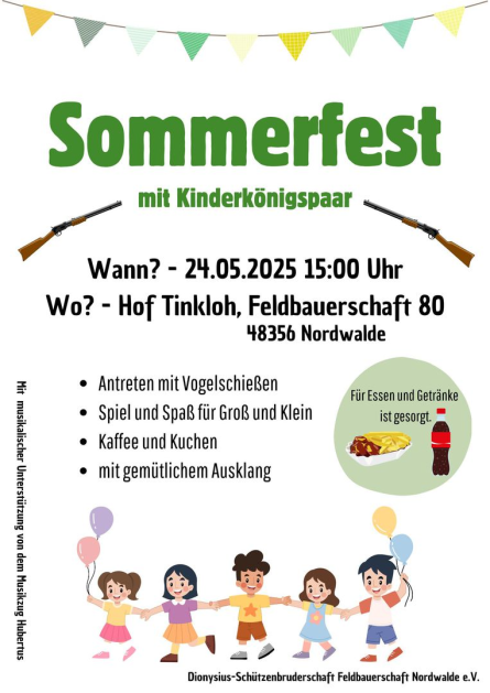 Am Samstag, den 24.05.25 sind Klein und Groß auf dem Hof Tinkloh, Feldbauerschaft 80, 48356 Nordwalde, herzlich zum Kinderschützenfest der Feldbauerschaft eingeladen. Um 15 Uhr wird zum Vogelschießen angetreten, um Nachfolger für König Joey Heitmann und Königin Lynn Isermann zu finden. Die Kleinen und Großen erwartet ein Tag voller Spiel und Spaß! Bei verschiedenen Spielen können die Kinder ihre Geschicklichkeit unter Beweis stellen, beim Glücksrad tolle Gewinne gewinnen, sowie sich auf der Hüpfburg so richtig austoben. Neben zahlreichen spaßigen Aktivitäten gibt es Kaffee und Kuchen, sowie Pommes und Bratwurst. Der Musikzug Hubertus sorgt für die musikalische Gestaltung. Abends lädt der Schützenverein zu einem gemütlichen Ausklang ein. Während des Kinderschützenfestes finden auch die Vorbereitungen zum großen Schützenfest mit dem „Rosen machen“ für alle Schützen und deren Begleitung sowie den Damen des Verein an selber Stelle statt.