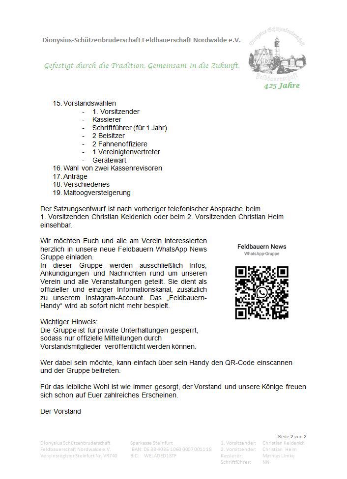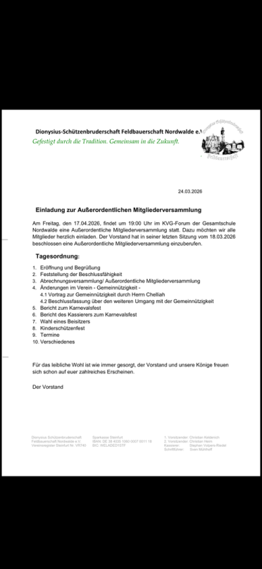 Die Feldbauern Schützen treffen sich traditionell am 26.12.23 ab 20 Uhr zur Stephanusversammlung in den Räumlichkeiten der Firma Hometex, Industriestraße 3 in Nordwalde. Zu den aktuellen Infos zum Vereinsgeschehen wird es auch wieder eine große Tombola geben. Für Getränke ist natürlich auch gesorgt. Des weiteren starten die Vorstandsmitglieder in Kürze mit dem Kartenverkauf für die Karnevalssitzung am 03.02.24