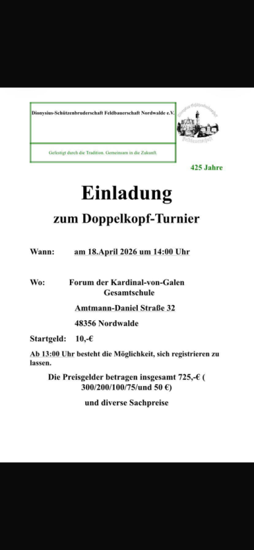Am vergangenden Samstag den 27.04.2024 fand das 12. Doppelkopf-Turnier der Feldbauern im Forum der KVG - Schule Nordwalde statt. 76 Spieler aus der näheren Umgebung, gingen an den Start um das Preisgeld von gesamt 900,-€ zu gewinnen. Den ersten Platz belegte Jürgen Eckloff mit 150 Punkten und sicherte sich somit das Preisgeld von 300-€ für sich. Auf Platz zwei kam Bastian Köhler und Platz drei errang Bruno Pflugradt. Der Dank des Vorstandes gilt allen Helfern und Unterstützern des Vereins.